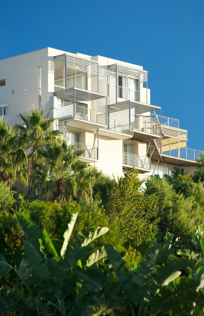 On the seaward side the site drops sharply and the building becomes dramatic, multi storied. Sheer walls rise out of the ground with lightweight louvered balconies projecting off the tops. The balconies extend and protect the living spaces by modulating the climate (both as sun and wind screens).